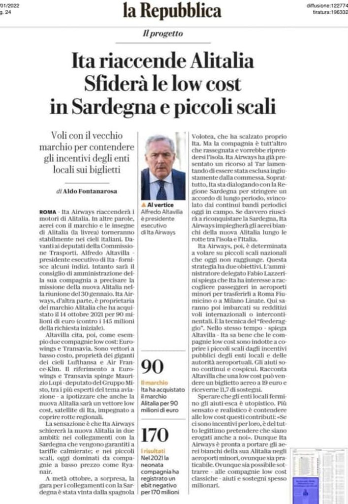 LE informazioni che giungono sono che il presidente di ALITALIA (ITA AIRWAIS oggi)oltre a occuparsi di essa, si sia attivato a una campagna promozionale che trovi altri imprenditori disposti a investire per la rinascita del trasporto aereo e abbia depositato al MIMS il progetto.