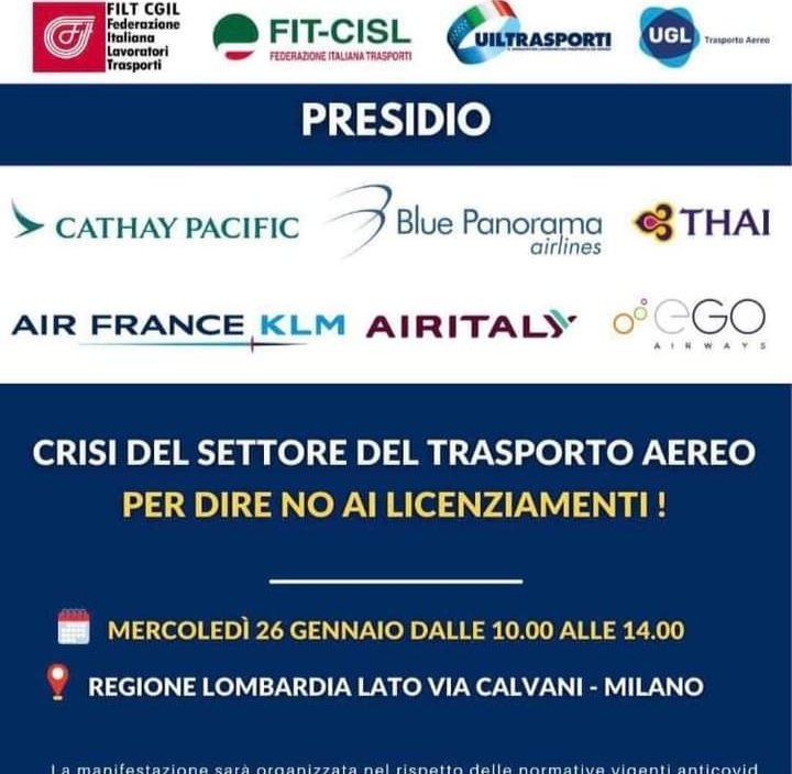 THAI e altre compagnie come AIRFRANCE, KLM, CATHAY PACIFIC, BLUE PANORAMA, EGO AIRWAIS e AIRITALY il 26 gennaio dalle ore 10:00 alle 14:00 manifesteranno ai piedi della Regione Lombardia in via Calvani – Milano, per chiedere ammortizzatori sociali previsti per i settori in crisi dovuti alla pandemia, reintegro e ricollocazione.