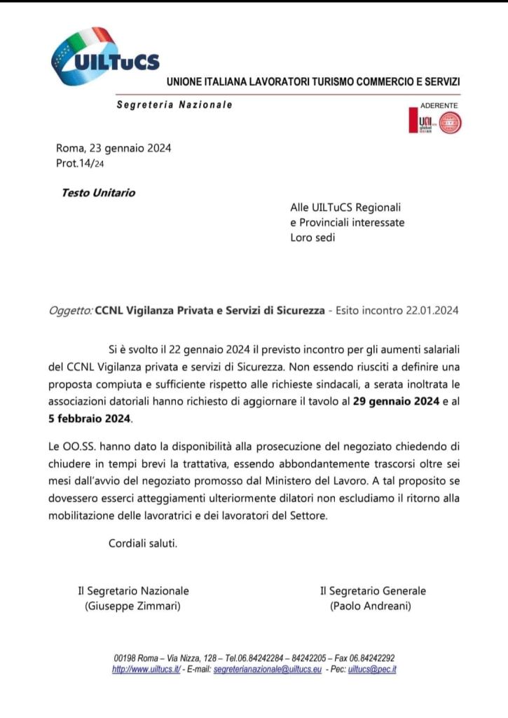 il Segretario Generale della CGIL/FILCAMS Maurizio Landini ha dichiarato che il contratto della Vigilanza il 01/06/2023 è stato firmato da € 5.00 a € 6.00 per colpa del tempo trascorso, 10 anni. (video in allegato)